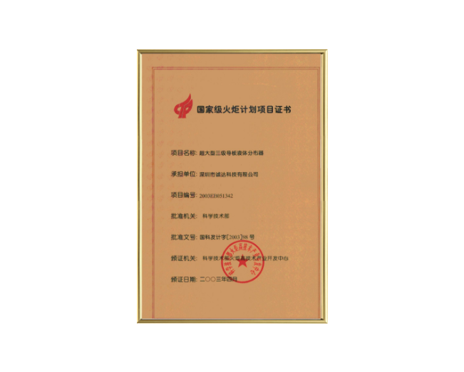 国家级火炬计划项目证书